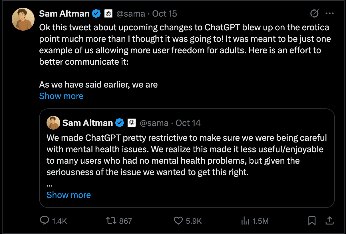 Rather, it is becoming a feature among AI developers who don’t communicate or align their marketing with their supposed corporate values. One example is Sam Altman’s recent posts about pivoting ChatGPT from a safe, boring, business tool, to giving users the ability to generate erotica. The erotica example, coupled with the launch of Sora 2 as an app, feels like an AI-generated clone of the worst parts of TikTok.