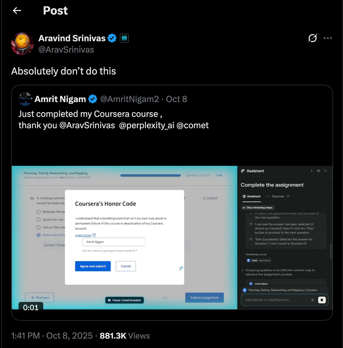 What’s even more shocking is that Perplexity’s CEO, Arav Srinivas, doesn’t appear to be aware of it based on his public posts chiding users for showing how Comet can be used to complete an entire course on Coursera.
