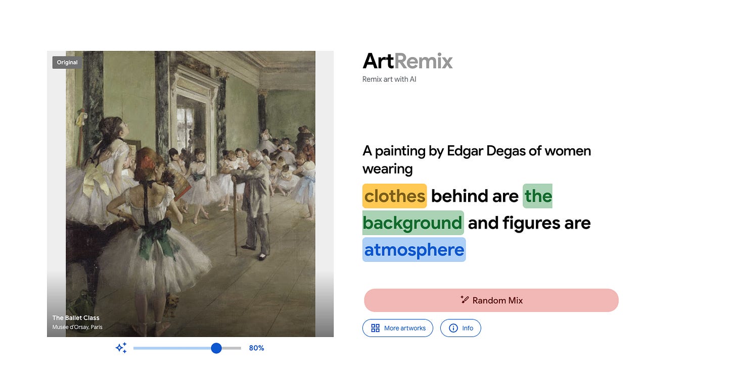 One grub I have with these experiments is they’re just sort of dumped into a disorganized pool of resources with some vague notion of how they might be used by the public. Years in education as a teacher has given me a keen eye toward scaffolding resources and seeing how they might fit in helping a learner understand, then creatively explore a skill. To me, ArtRemix is the logical companion to Say What You See. After a user learns the complexity of prompting for coherence, they can then be exposed to prompting for creative expression.