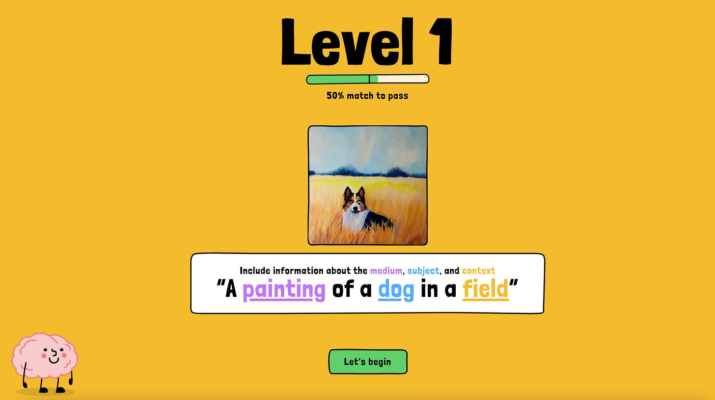 One of the most challenging aspects of teaching someone how to prompt an LLM is understanding that prompting is a highly iterative process. A user needs practice with a number of knowledges to get a competent output. This is where Say What You See shines. It teaches users the basis for prompting an LLM for image generation in progressively challenging rounds that require more focus and accuracy. What educators have noticed and tried to convey to learners is they’re not going to achieve an amazing response without first knowing what they want an output to be. To do that, they need: