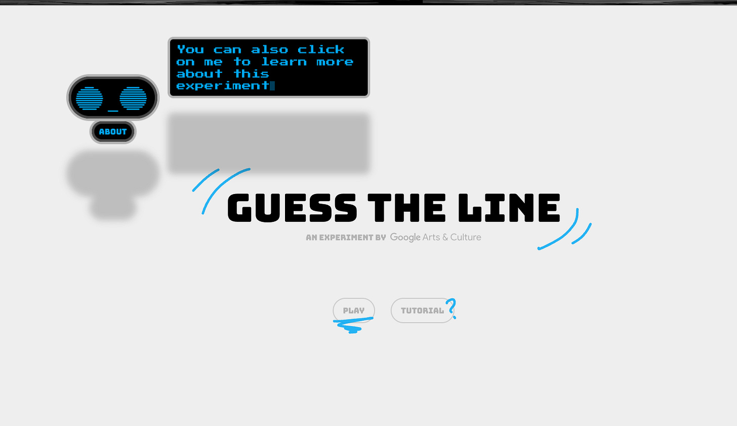 Guess The Line appears to be an even more sophisticated version of Quick, Draw! It’s certainly much more challenging and really requires the user to engage all the knowledges discussed her to get a coherent output by drawing three images in less than 60 seconds. I think it is a really sharp teaching tool for students to explore neural networks.
