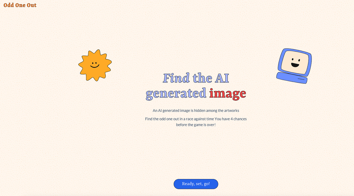 The implication for image generation technology to warp digital space with propaganda, deep fakes, misinformation is one of the alarming real-world harms occurring now. It’s a heavy topic, and not one that’s easy to broach with k12 or some students in higher education. But Odd One Out lets users explore digital trickery by asking them to make an educated guess about what image out of a series of four was generated. Like I said with Say What You See, the user quickly discovers they need some level of familiarity with their subject in order to have a chance at the game.