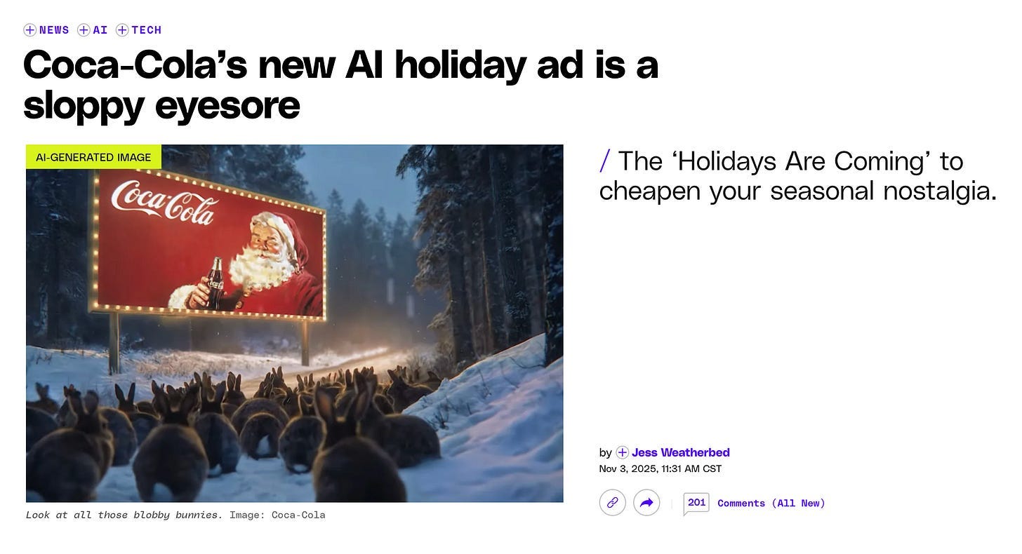 The Coke holiday commercial isn’t going over well with audiences. Neither is the latest campaign by the AI wearable Friend. I wrote about the wearable AI technology last year and how deeply upsetting the concept of treating a device like a human companion is for mental health, privacy, and surveillance.
